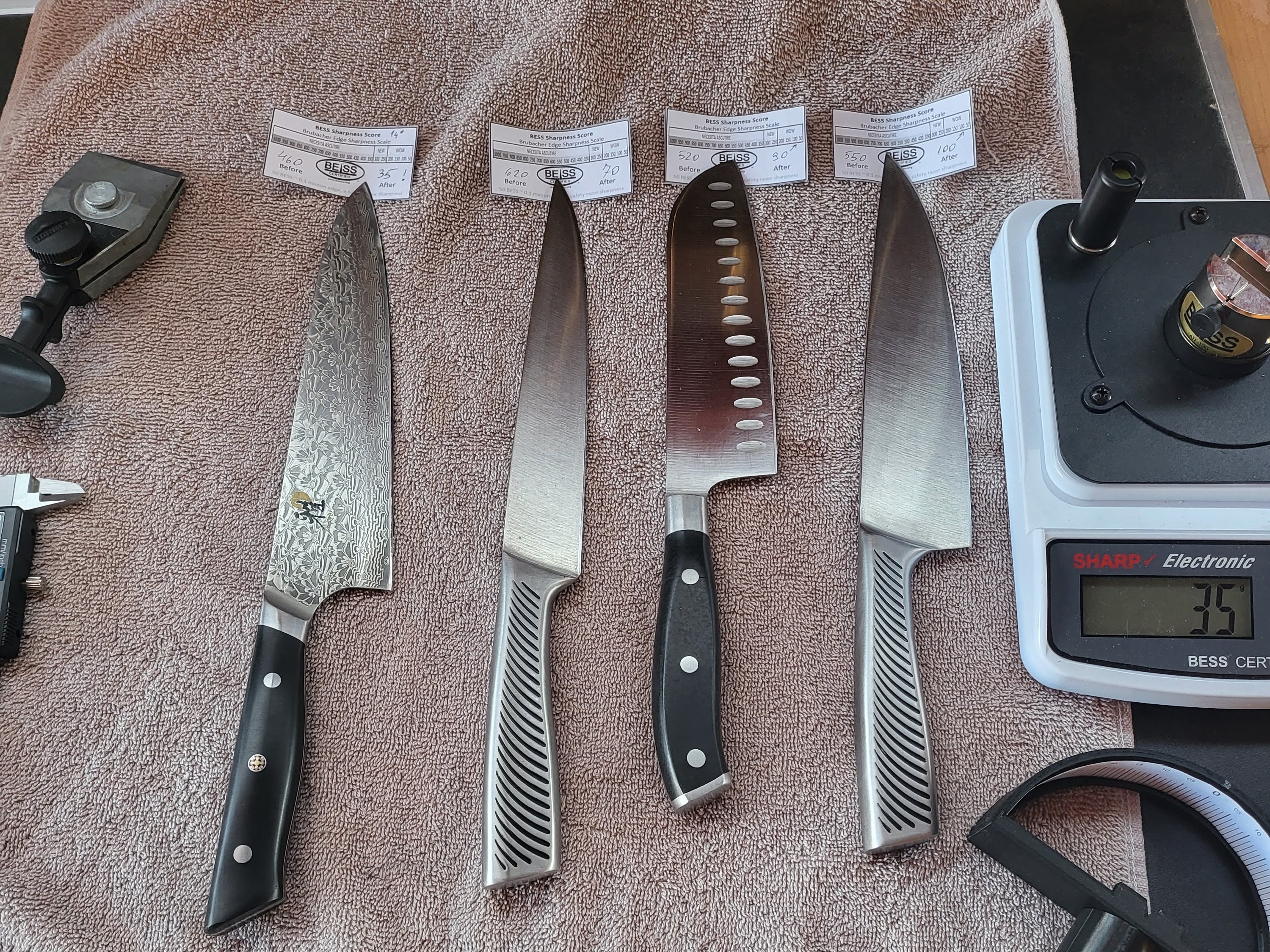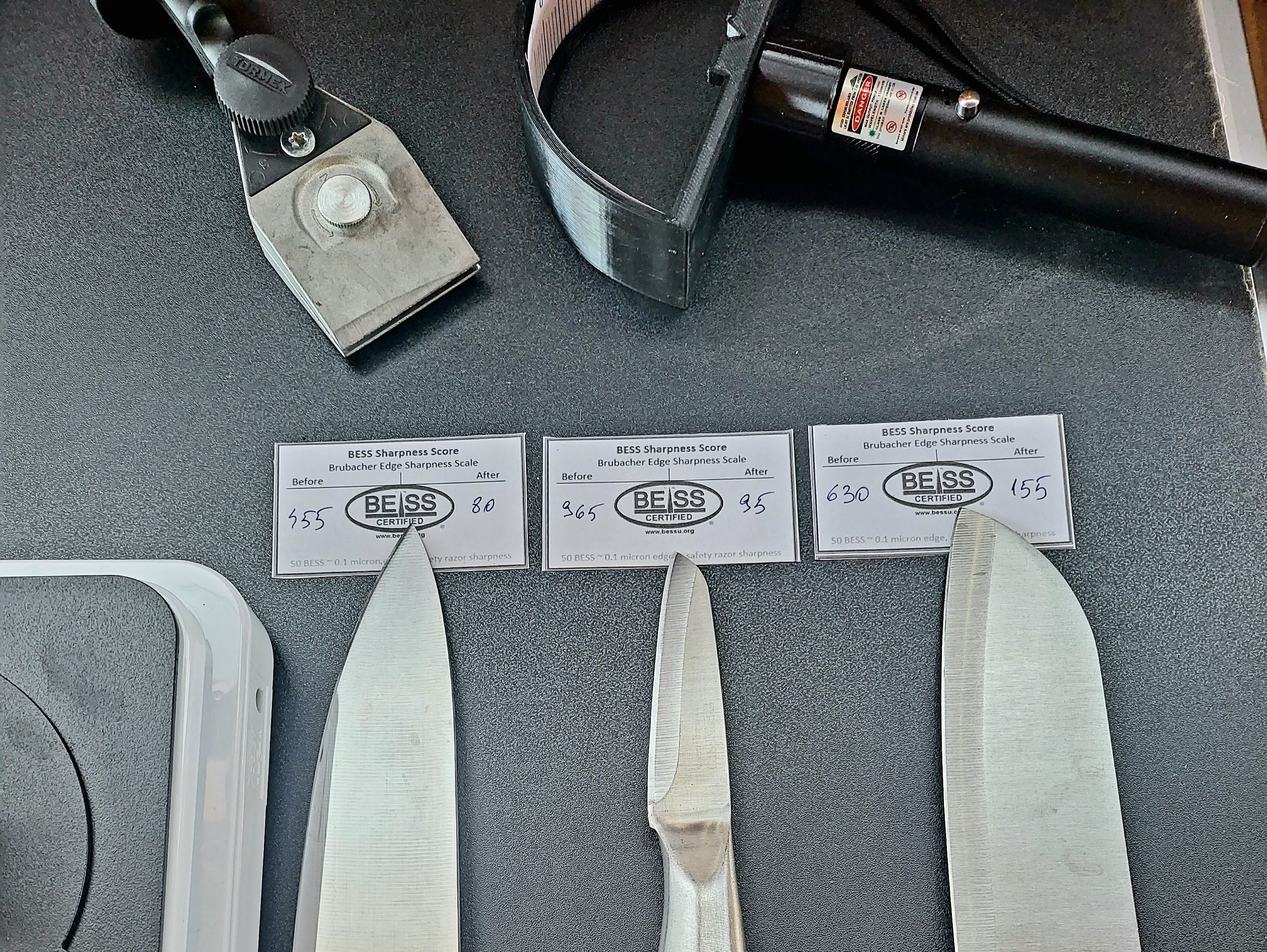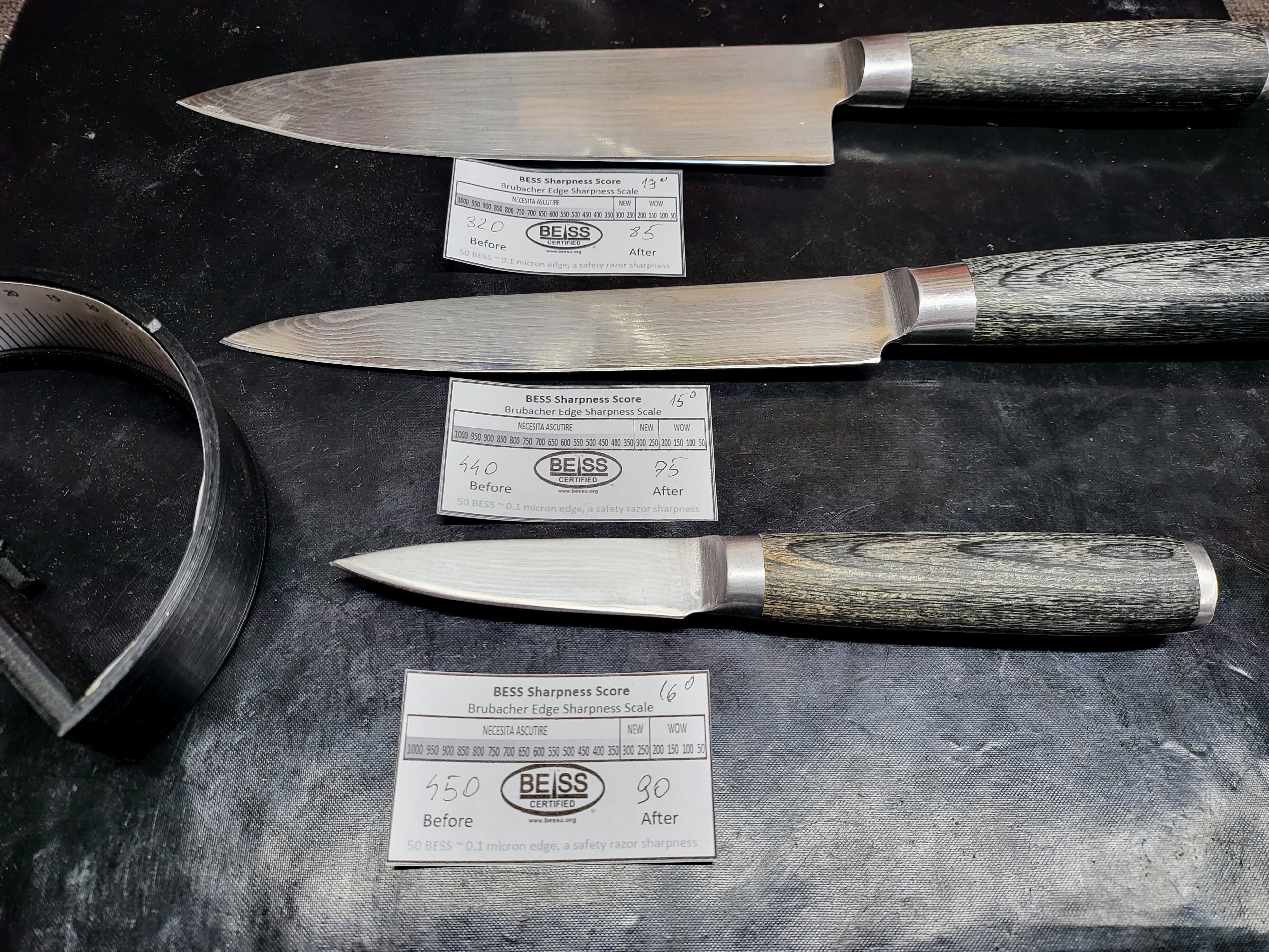 Ce a pornit dintr-o curiozitata a ajuns o pasiune, iar pasiunea impreuna cu sculele potrivite duc la rezultate exceptionale. Inginer fiind imi plac lucrurile exacte de asta intotdeauna imi place sa stiu exact ce fac, pentru a verifica rezultatele folosesc testerul BESS in loc sa spun ca "taie" pot spune exact cum taie. Folosesc microscop digital pentru a vedea si cea mai mica imperfectiune din munca mea deoarece perfectiunea vine cand si cel mai mic detaliu e perfect. Folosind goniometru laser pot masura la nivel de grad unghiul cutitului si folosesc ghidaje profesionale din sistemul Tormek T8 pentru a respecta perfect unghiul cerut iar asta face diferenta, taisul iese perfect de la baza pana la varf. Putand masura duritatea otelului pot calcula unghiul perfect pentru cutitul ascutit iar asta face sa pot scoate maximul din orice lama. Pentru ca imi plac lucrurile complexe reconditionez obiecte taioase, iar de la a scoate rugina din orice pana la a readuce la iveala dungile dintr-un damasc am cunostintele si echipamentul pentru a reconditiona aproape orice.